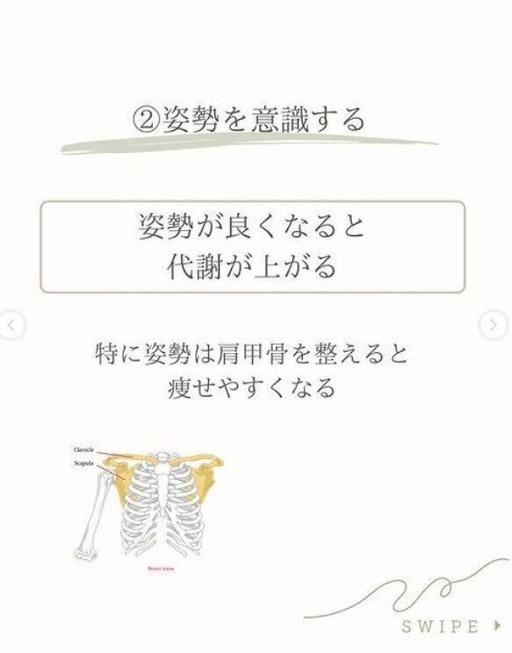 姿勢を意識することも大切だといいます。姿勢がよくなると代謝があがるのだそう。とくに肩甲骨を整えると痩せやすくなるといいます。なかなか運動ができない、あるいは続かないという人も、まずはここから始めてみるといいですね。