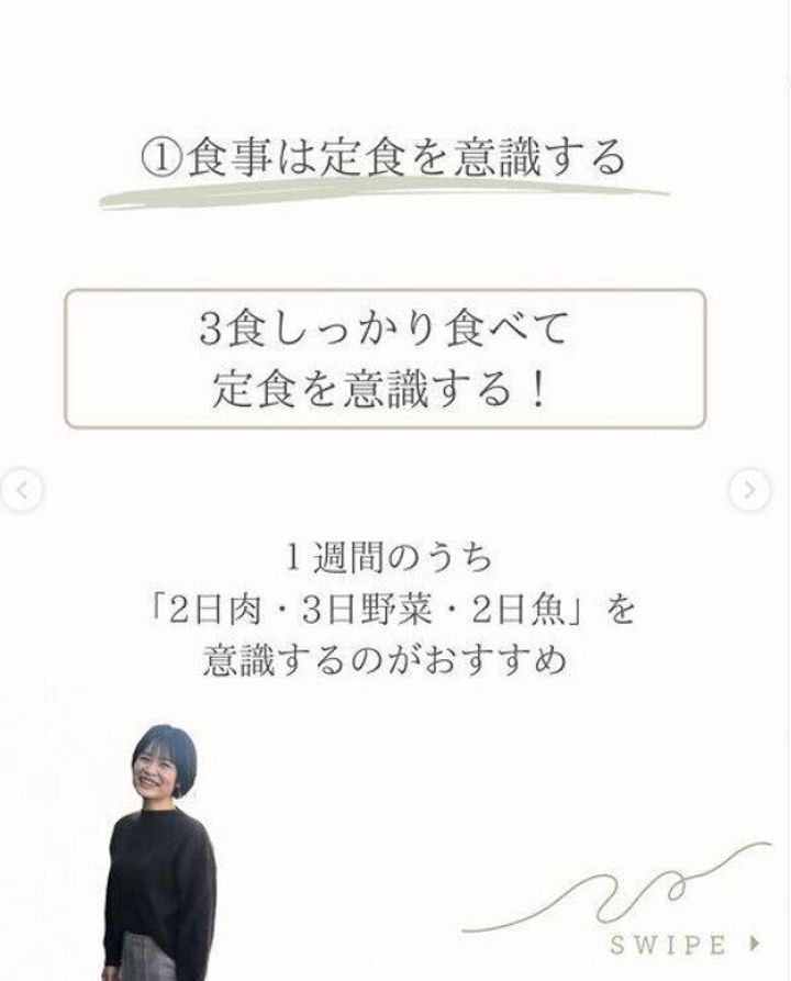 食事は、定食スタイルでバランスよく食べることが大切だといいます。3食、しっかりと栄養バランスのよい食事でまずは体を整えていきました。1週間のうち、「2日は肉、3日は野菜、2日は魚」というように意識していくのがおすすめなのだそう。
