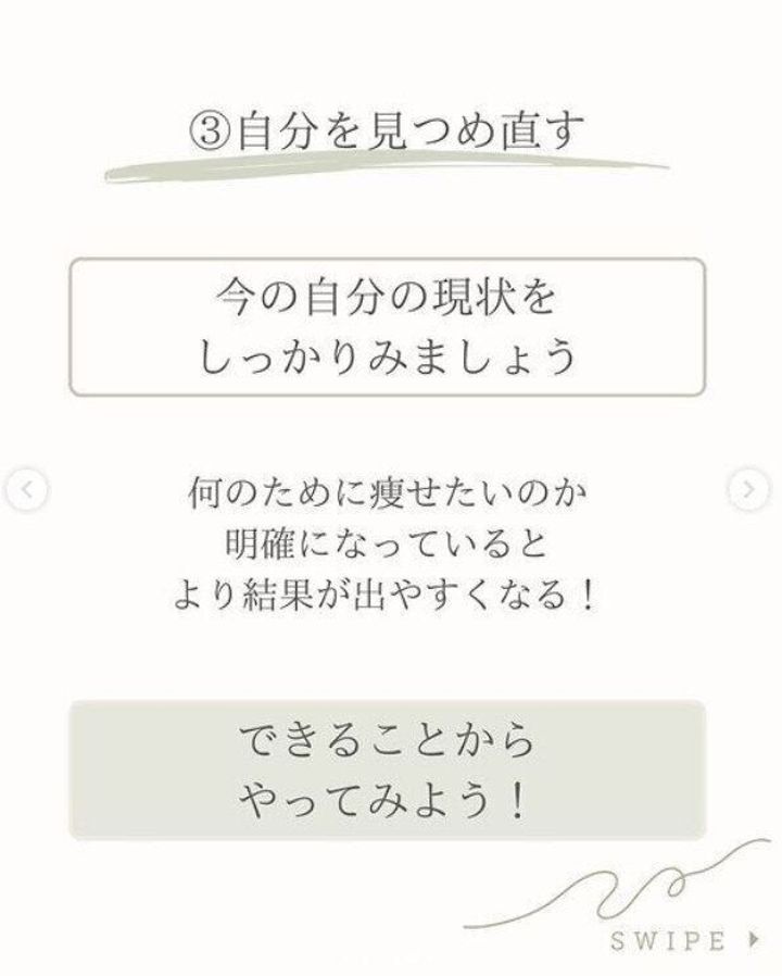 あなたは「ただ痩せたいから」とがむしゃらにダイエットを始めていませんか?あなたの今の生活は太る生活ではないですか?あなたの性格にあったダイエットはどんなもの?痩せてどうなりたい?など、改めて自分と向き合うことから始めてみたいですね。wellness_satokoさんのダイエット、ぜひ参考にしてみてくださいね。