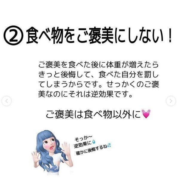 「食べ物をごほうびにしない」というのもzuboran__beautyさんのダイエットのポイントなのだそう。ごほうびとして食べたあとに、また体重が増えてしまったら、「きっと後悔して食べた自分を罰してしまう。せっかくのごほうびが逆効果です」といいます。ごほうびは食べ物以外で見つけていくといいのだそう。