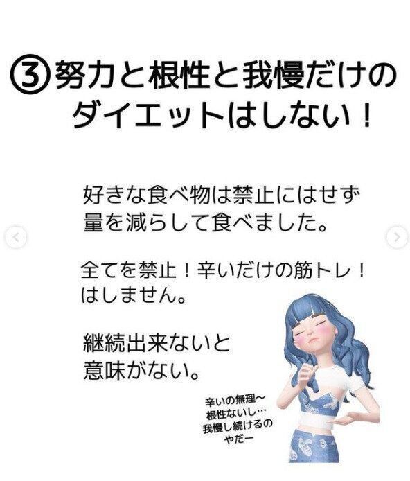 絶対にお菓子は食べない!といったダイエット、あなたは続けることができますか?zuboran__beautyさんのダイエットのポイントは、「努力と根性と我慢だけのダイエットはしない」ということ。たとえば、好きな食べ物は禁止にするのではなく量を減らせばいいのです。「継続ができないと意味がありません」といいます。我慢をするのではなく、ほどほどに調整するということなら無理なく続けていけそうです。