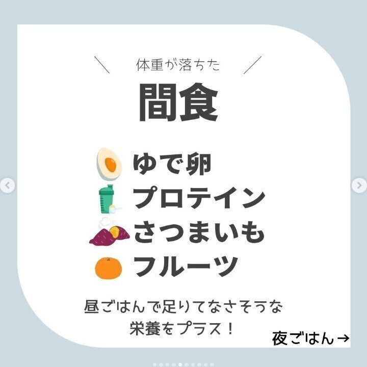 間食は朝、昼ごはんで足りていないなと思う栄養素をプラスするのがポイントなのだそう。ゆで卵、プロテイン、さつまいも、フルーツなどがおすすめ。