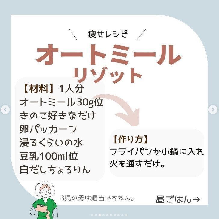 朝は、鉄分も豊富な「キノコ入りのオートミールリゾット」。鉄分が不足すると女性は痩せにくいのだそう。朝は鉄吸収がよく、鉄分豊富な食事がおすすめだといいます。