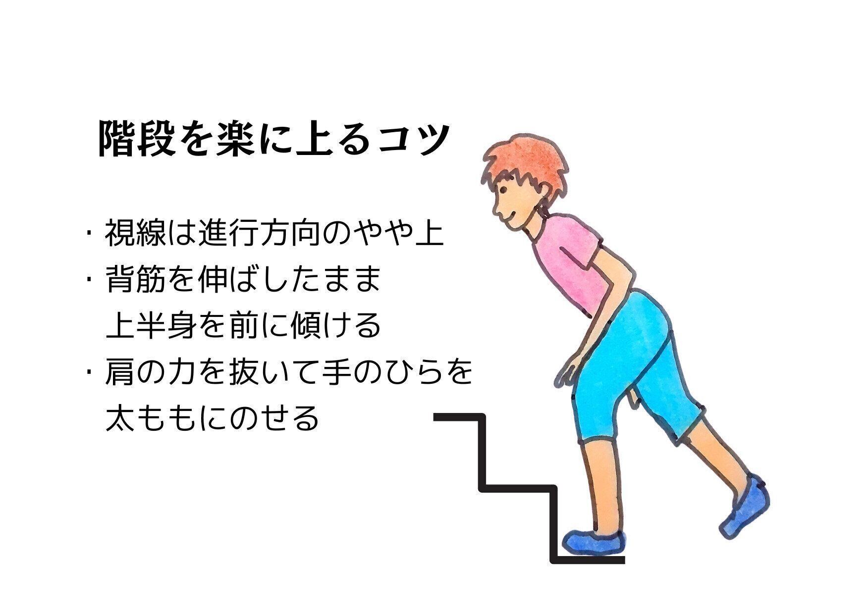 腰から上半身を倒すことで、進行方向に体重がかかりやすくなり少ない力で階段を上がることができます。