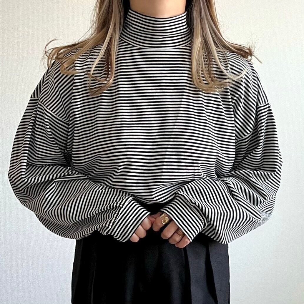 黒のタートルネックをレイヤードしても間違いないですが、ボーダーを入れることで一気にこなれ感が出る気がします。