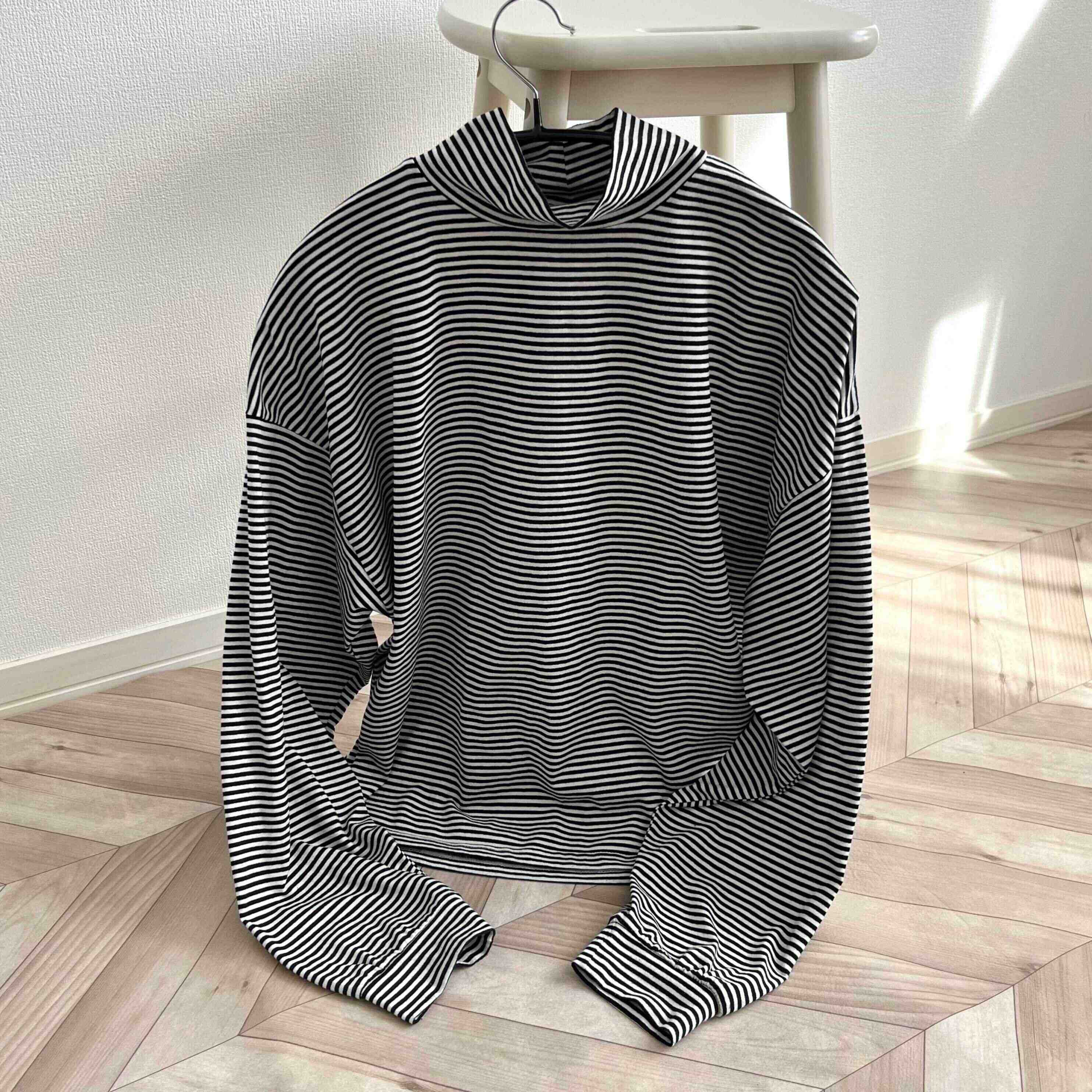 筆者は丸顔なのでタートルネックが苦手なんですが、こちらはハイネックなのでタートルネックよりも首元がすっきり見えします♪ネックの立ち上がり方もとても綺麗です。ひとつ注意点をあげるとしたらネック部分の伸縮性が全くないので着るときに1回頭がハマります(笑)だけどそれほどヨレにくいということでもあるので個人的には問題ありませんでした。