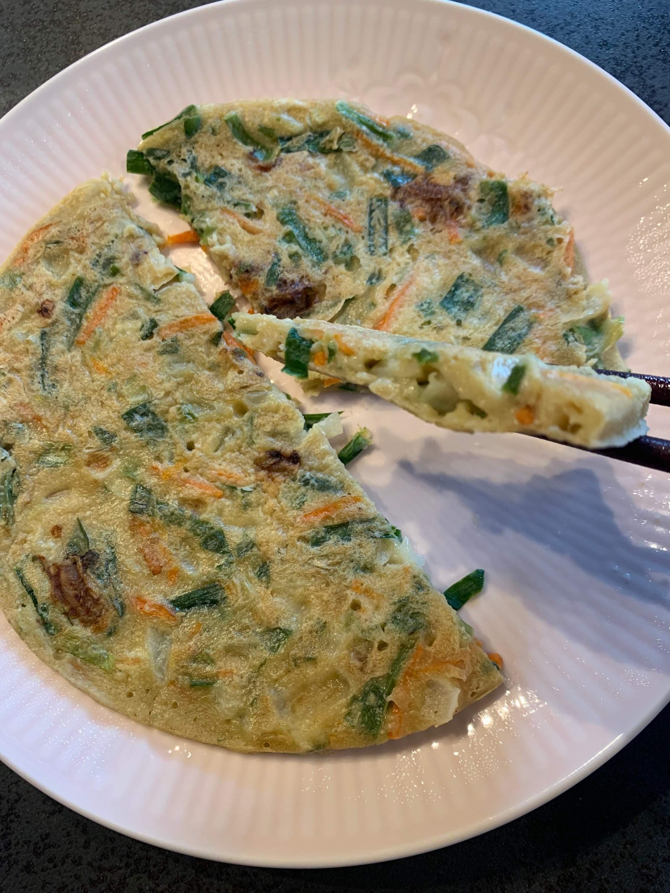 4種の野菜(タマネギ、ネギ、にんじん、ニラ)といかが入ったシンプルなチヂミ。