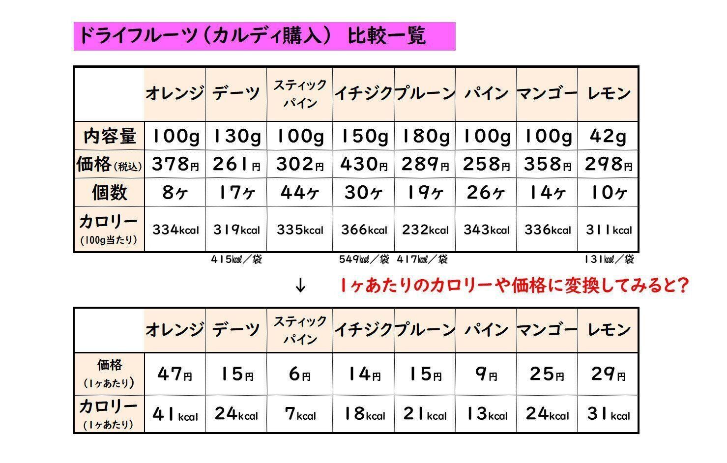 1個あたりのカロリーと価格比較