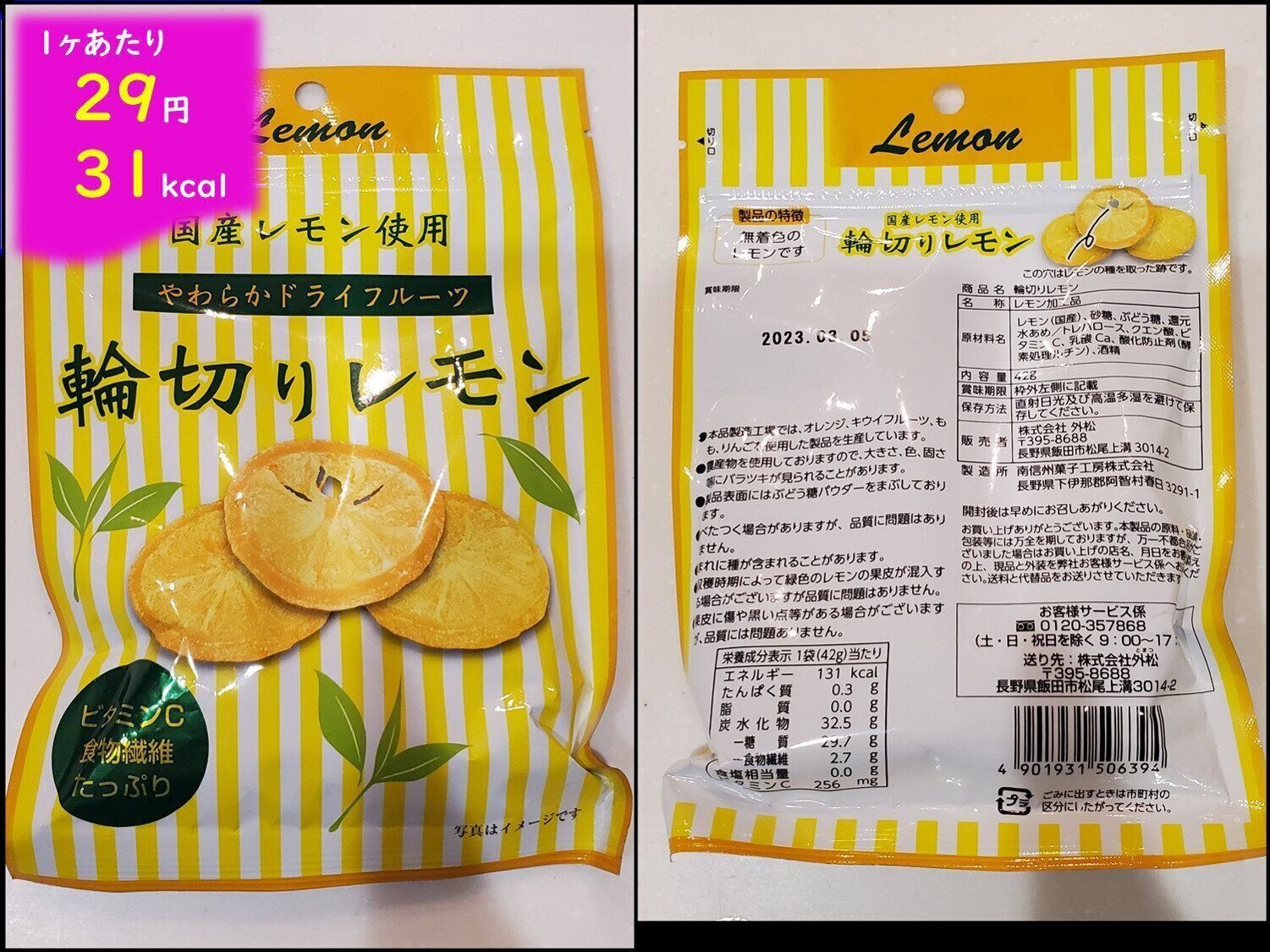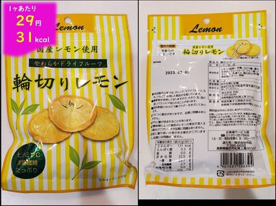 注意すべきは、レモン。これはカロリーが低そうなイメージですが、砂糖や水あめの添加されている量が多いのか、逆に高い!