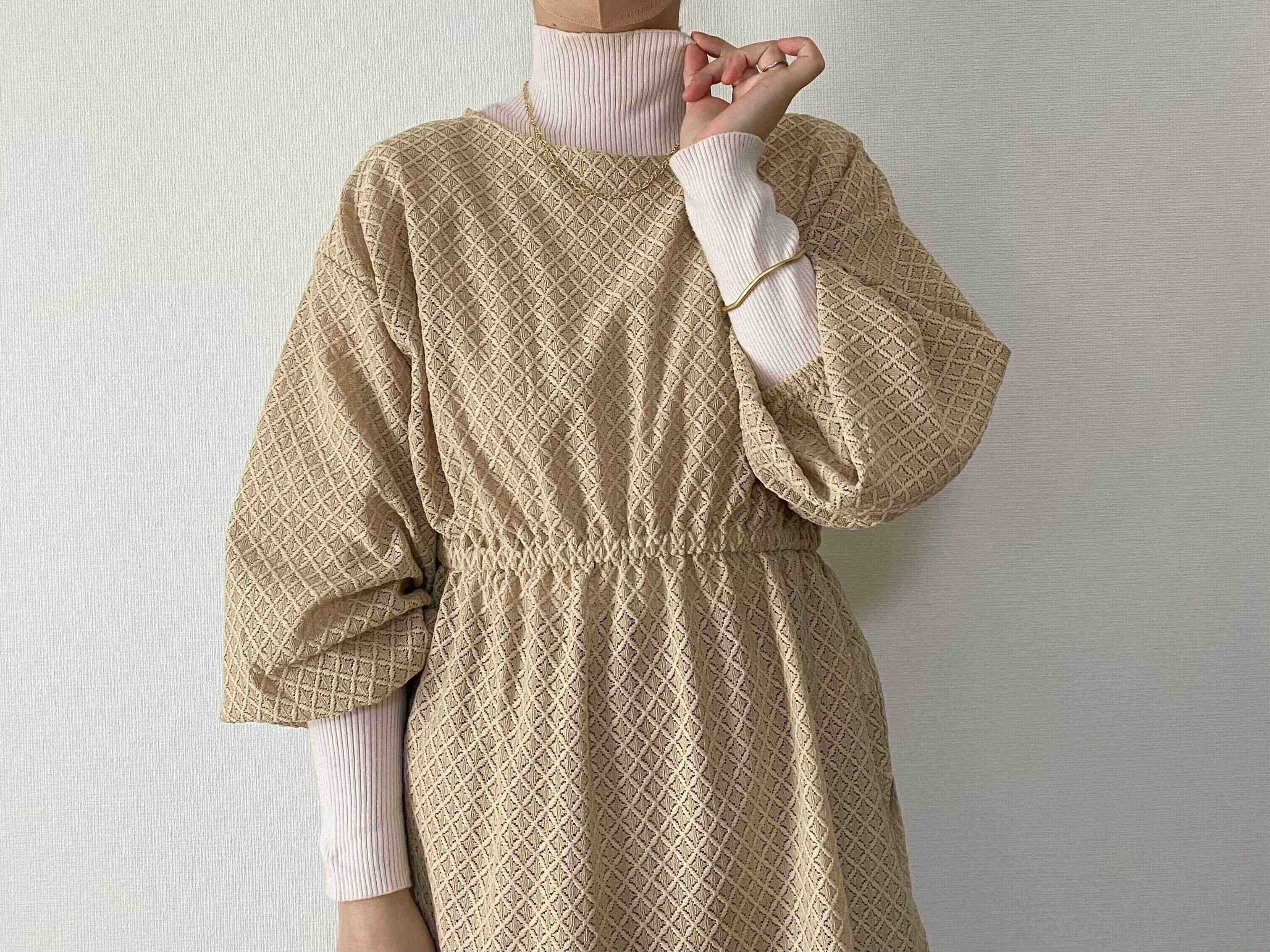 まだ1枚では寒いという場合は右のようにインナーにハイネックを入れて着ると今からでも着回しを楽しめそうですよ。