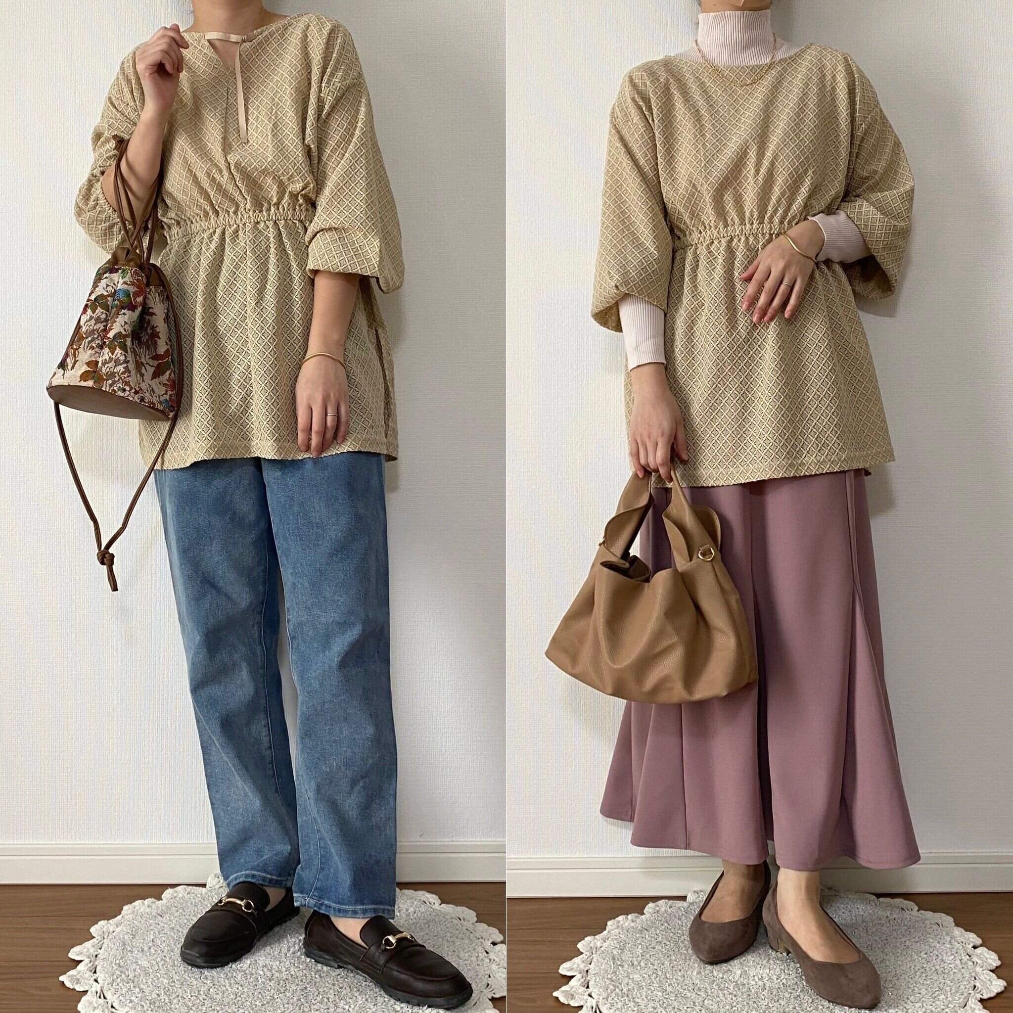 ウエストが絞られたデザインでかつレース生地なので大人の女性らしさがありデニムと合わせてもカジュアルになりすぎません。