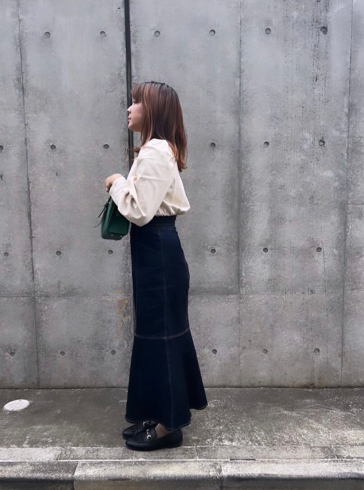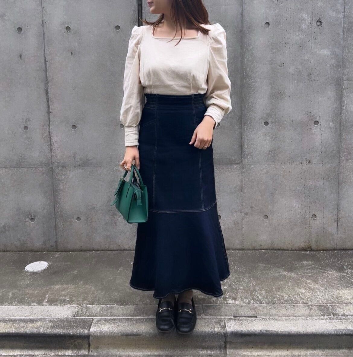 スクエアネックのブラウスとトレンド感のあるマーメイドデニムスカート。