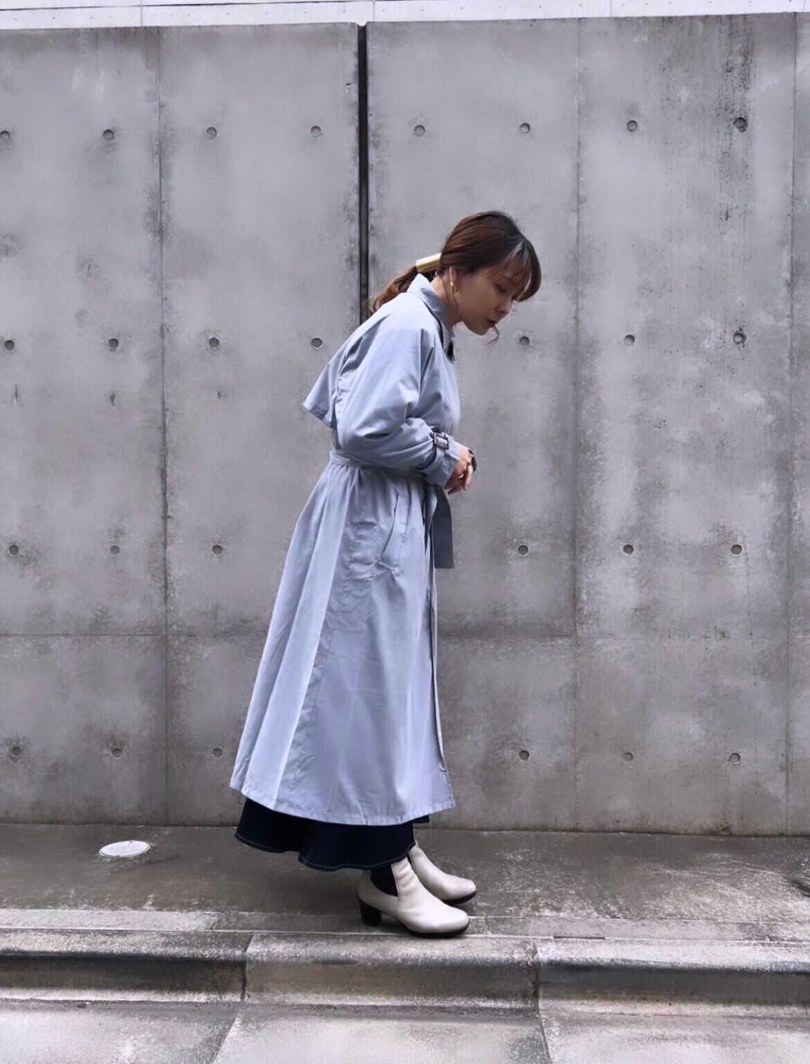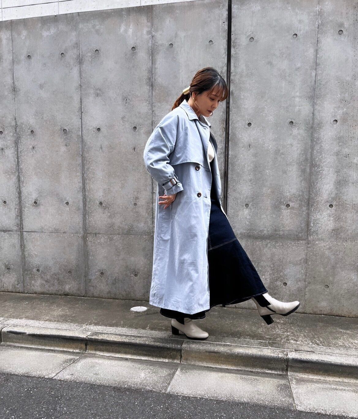 今季のトレンチコートはケープぽくなっていてボタンをとめてワンピース風に着てもかわいいです。