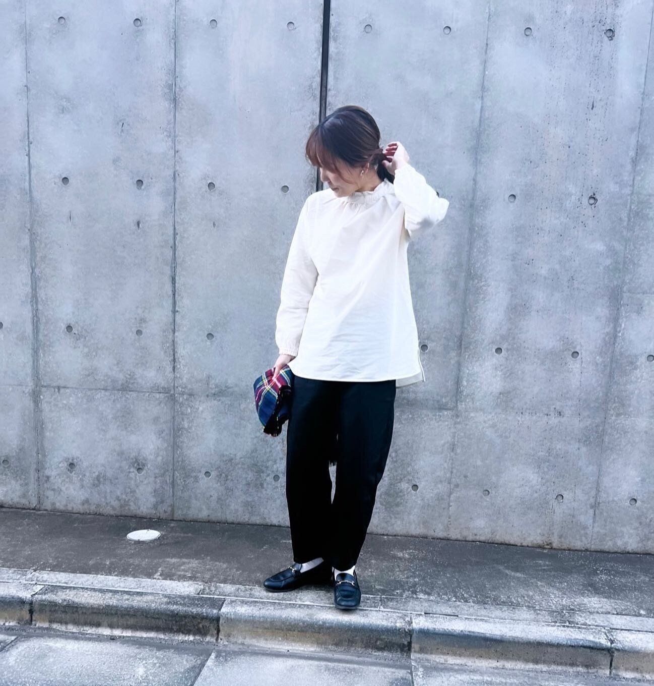 ブラウスとテーパードパンツのコーディネート。おしゃれ&防寒になるストールやコーディネートのアクセント&防寒になる靴下は、まだまだ寒さが残る春におすすめの小物使いです!ほんのり甘めのブラウスはビットローファーを合わせてマニッシュさをプラスすると大人女子にもしっくりくるバランスのいいスタイリングに。
