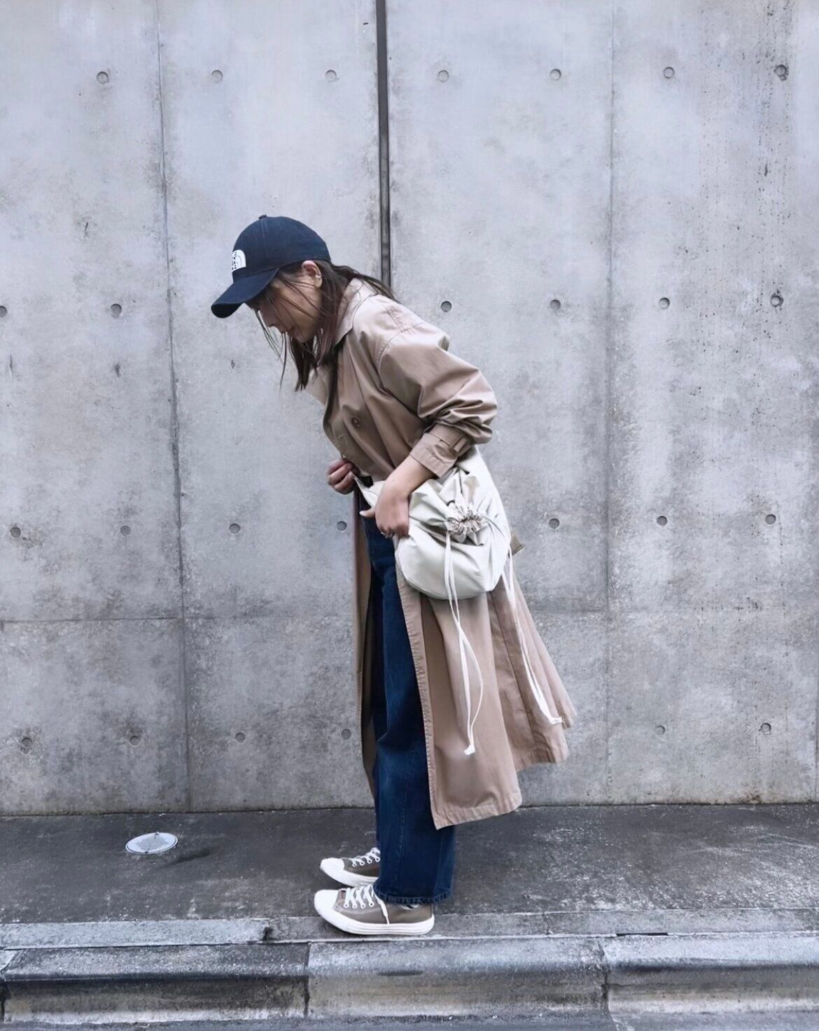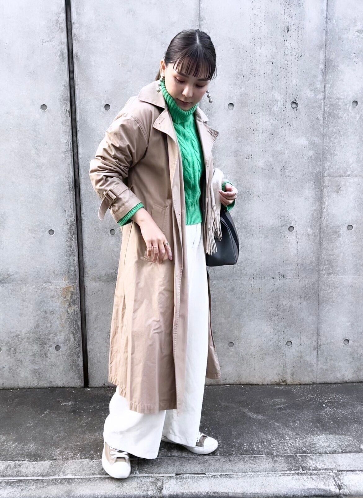 ベージュ×グリーン。ハッと目をひくグリーンが主役のスタイリング。落ち着きのあるベージュと合わせることでいい塩梅で目出させることができます。コートと合わせたコンバースのベージュがバランサーの役割に!