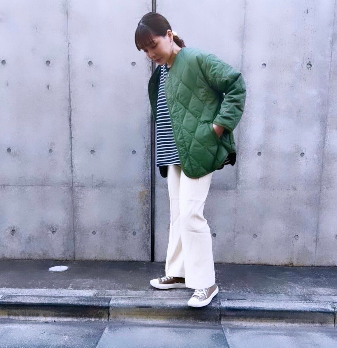 早春のマリンコーデ。ボーダーカットソーにカーキのキルティングジャケットを合わせた大人カジュアルスタイル。
