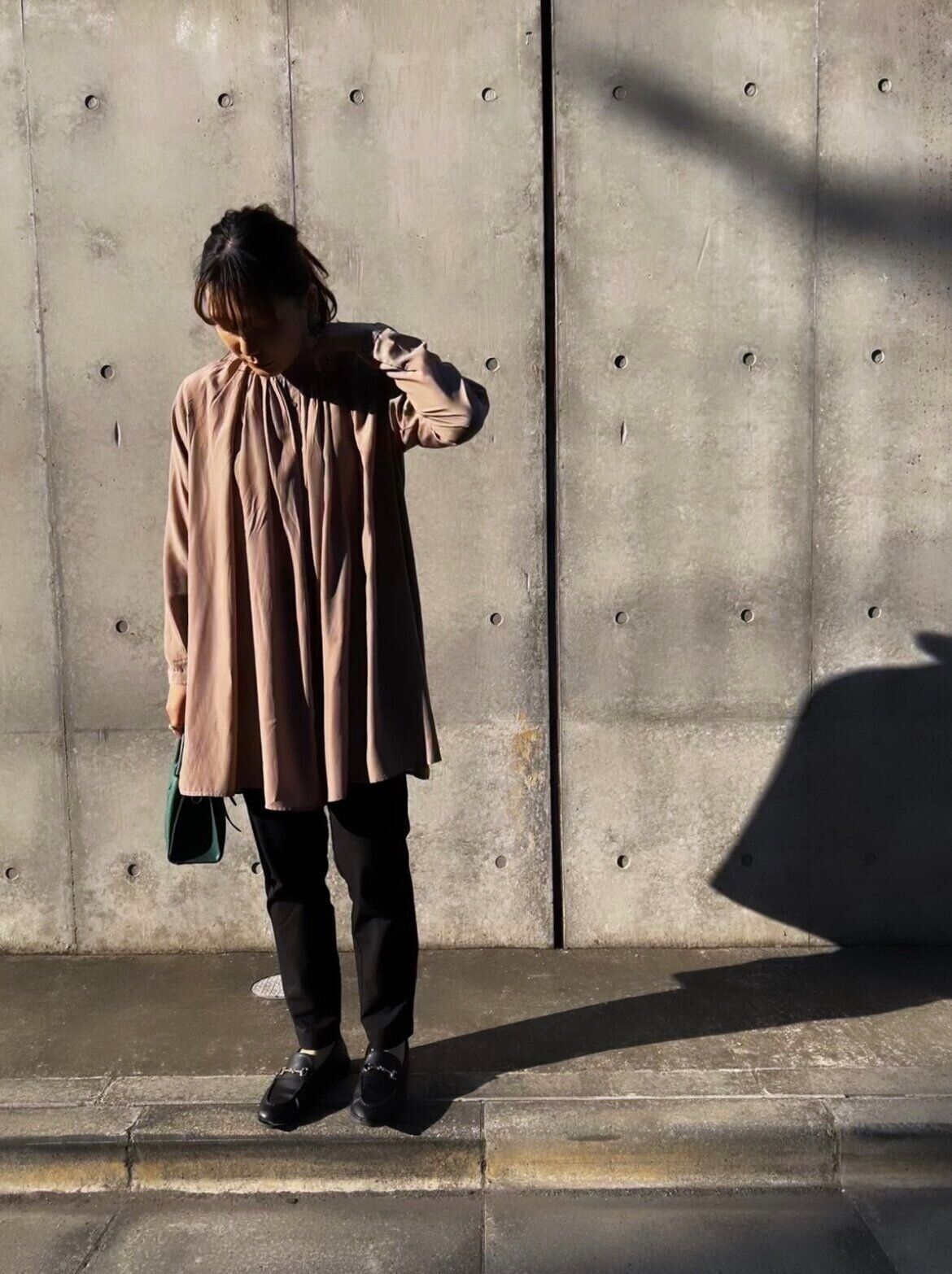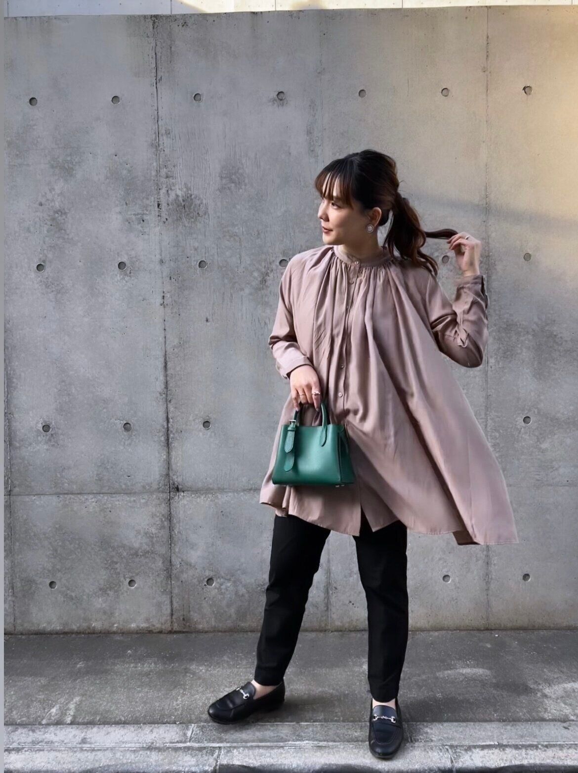 トレンドのグリーンのバッグを差し色に!私のような丸顔さんは首詰まりのトップスを着る時は、髪をまとめるとスッキリ見えますよ。
