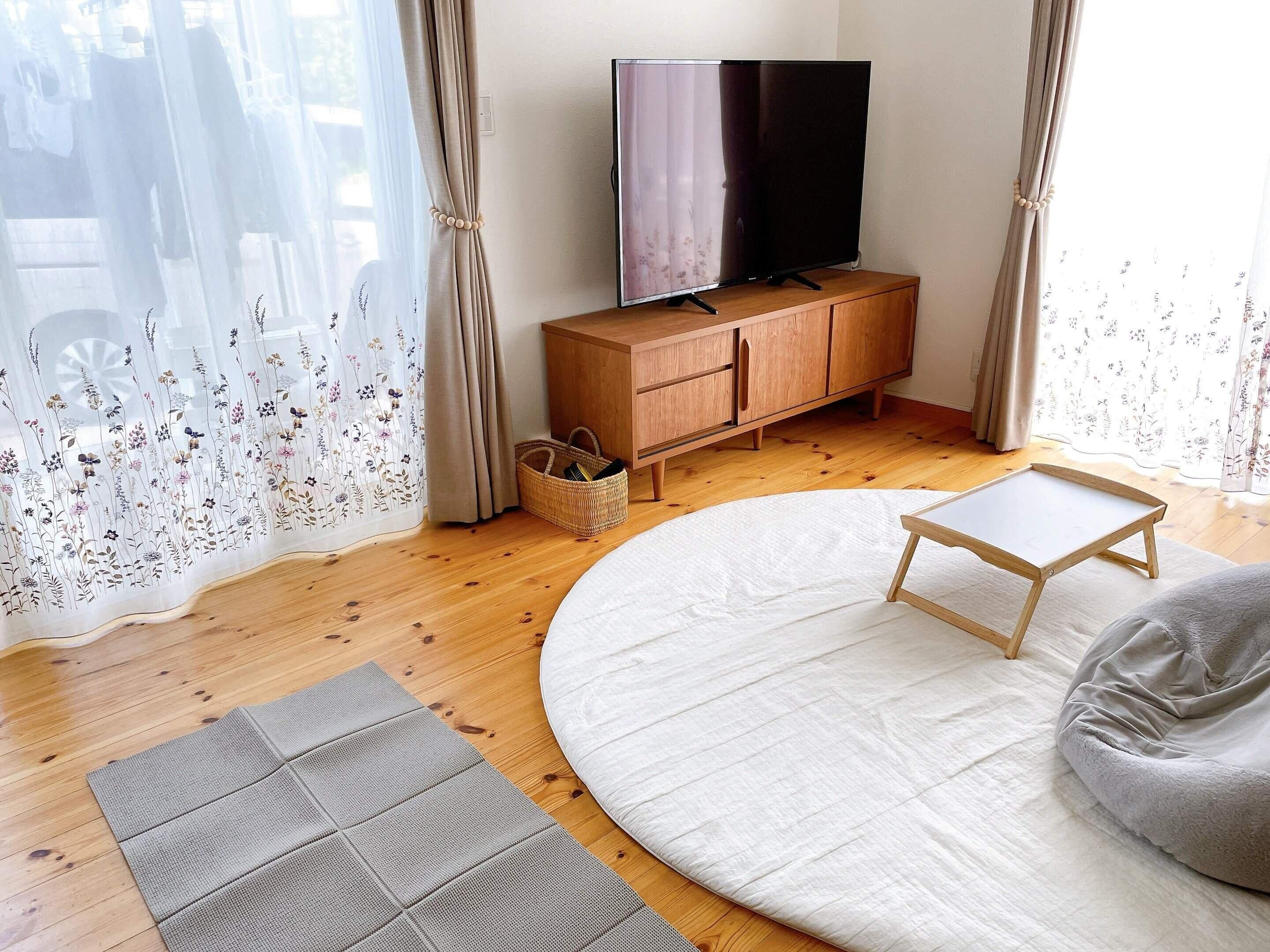 TVボードの横に置いているのですが、カラーもグレージュを選んだのでインテリアの邪魔をしない。