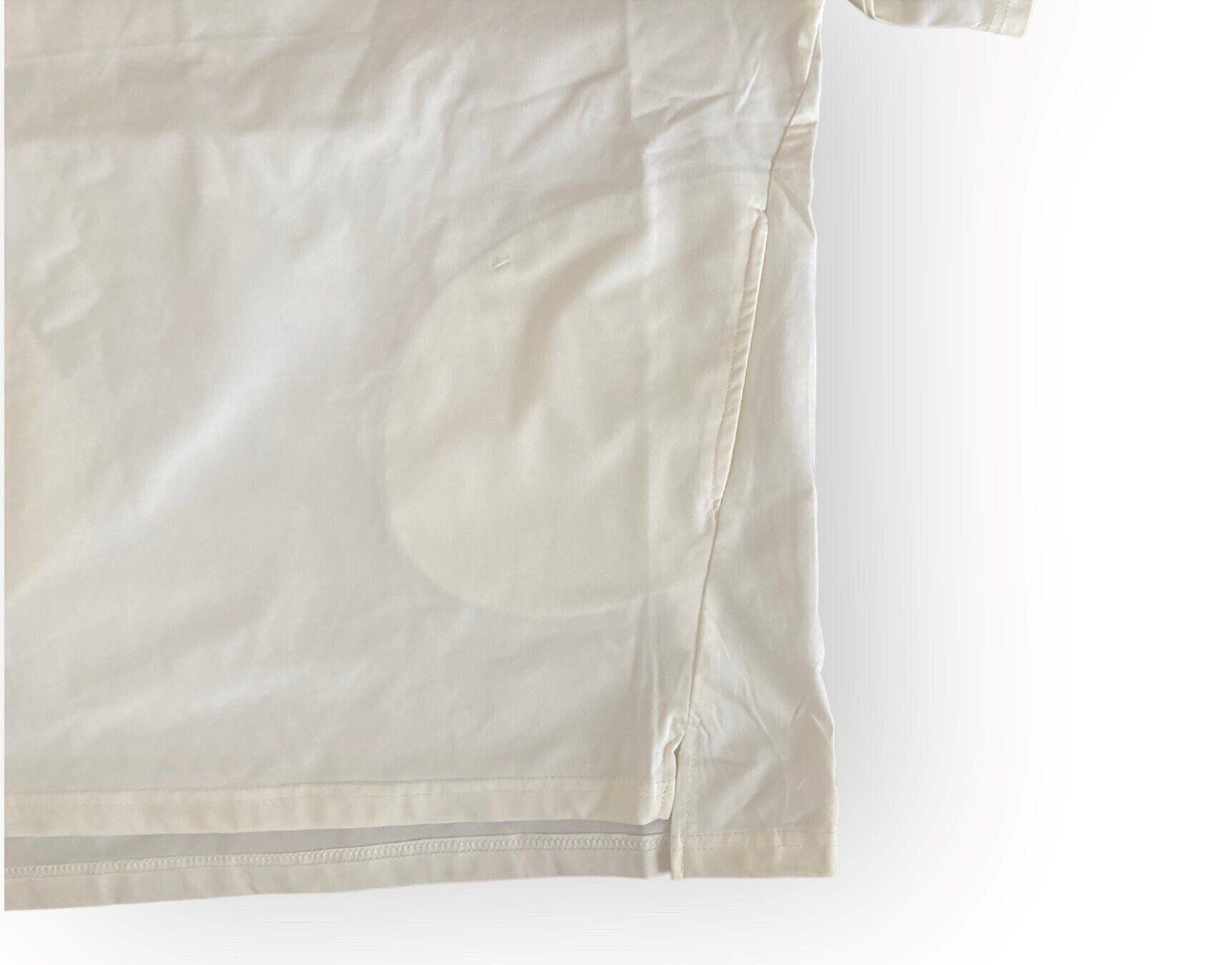 前後で裾(すそ)の丈が違い、後ろの方がやや長めです。動きやすいサイドスリットが、デザインとしても活きています。