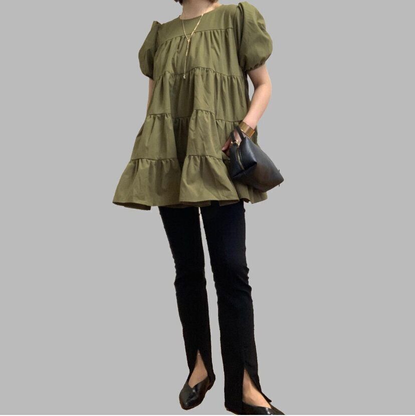 フレアトップスは可愛らしい印象のものが多いのですが、「カーキ」のティアードブラウス(2,690円)を選べば大人っぽくクールな印象を残したコーディネートが楽しめます。