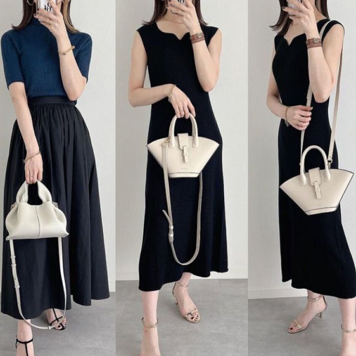 GUの「リブニットワンピース/2,990円」は、さきほど紹介したユニクロのワンピースよりもややルーズなシルエットが特徴的。着れば自然とリラックス感のある雰囲気になるので、肩のこらない着こなしが叶います。スクエアになったネックラインは、合わせるネックレスのデザイン・長さを選びません。華奢なものから大きなコインネックレスまで試してみて。