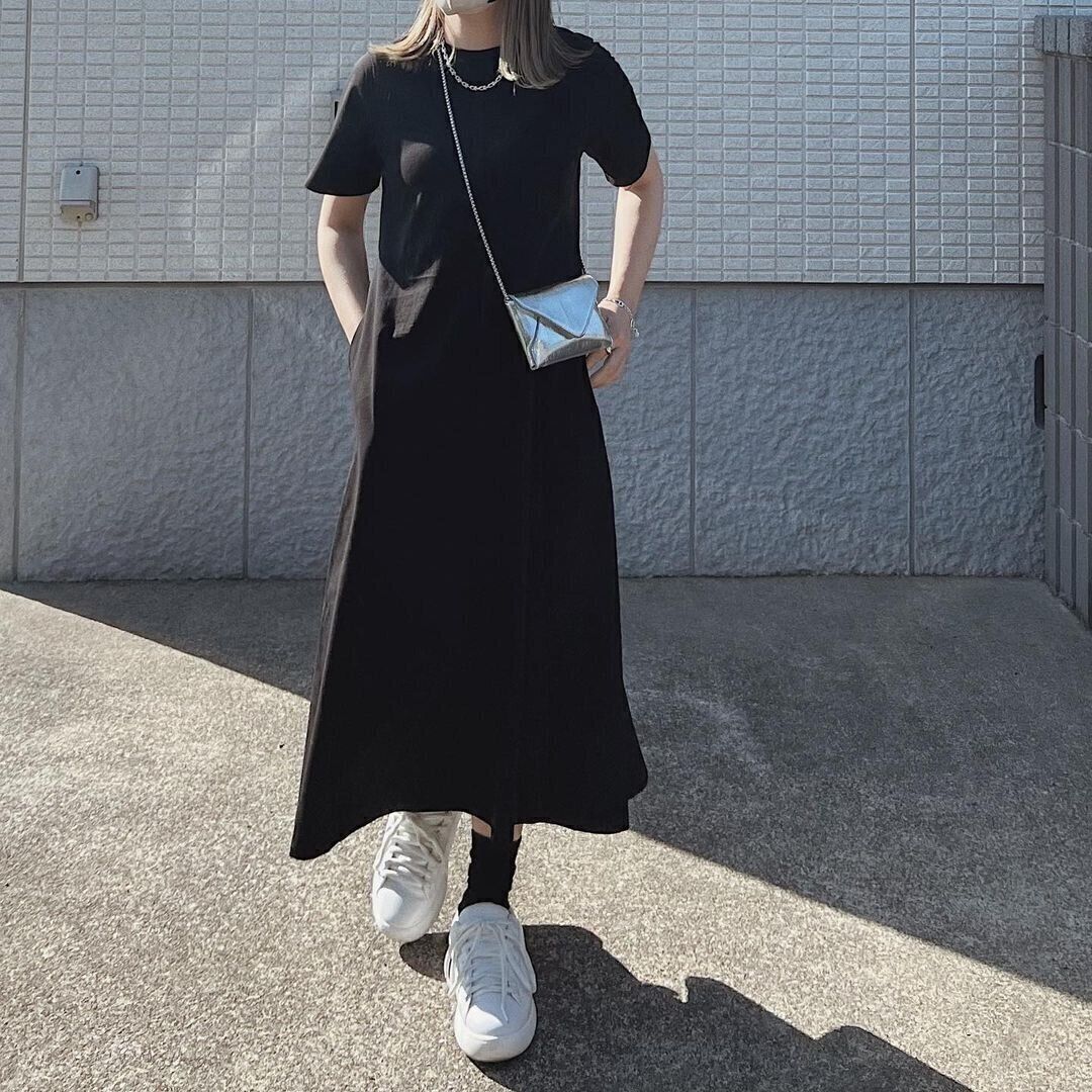 1枚でサマになれて、合わせる小物次第で印象を変えやすいのが、GUの「カットソーフレアワンピース/2,490円」。袖があり二の腕が“丸見え”にならないので、1枚でも安心感があります。シンプルに見えますが、ウエストがシェイプされて見えるデザインや、広がりを感じる裾のスカートなど凝っているワンピースです。加えてポケット付きなのも便利!