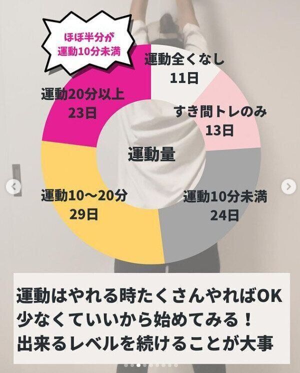 「100日ダイエット」に成功したdiet_tenten2さん。ダイエットでいちばん大事と感じたことは「継続すること」だといいます。ご本人いわく「3日坊主」とのことですが、それでも100日にわたって続けることができた理由。それは、できるだけハードルを下げて、毎日、自分が続けられることを見つけたこと。まずは、1日30秒の運動をしてみる、まずはお菓子を1つ減らしてみるなど、できることから始めて習慣にしていくことが大切なのです。