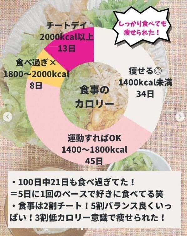 といった5つ。写真は、100日間の食事の様子を円グラフにして分析されたもの。見直してみると、できた日やできなかった日もあったそうですが、バランスのよい食生活に改善することで、食べる楽しみを損なうことなくダイエットを続けることができました。