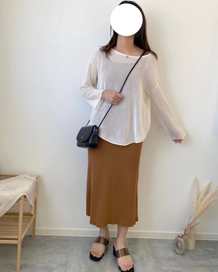 合わせるアイテムが難しい印象のある今季トレンドのメッシュトップスの相棒としても大活躍してくれるリブニットワンピース。ワンピースがすっきりとしたシルエットなので、少しルーズなデザインのメッシュトップスを合わせても着ぶくれしません。おしゃれな印象を与えつつ体型カバーもしっかりしてくれるコーディネートはぜひマネしたい!