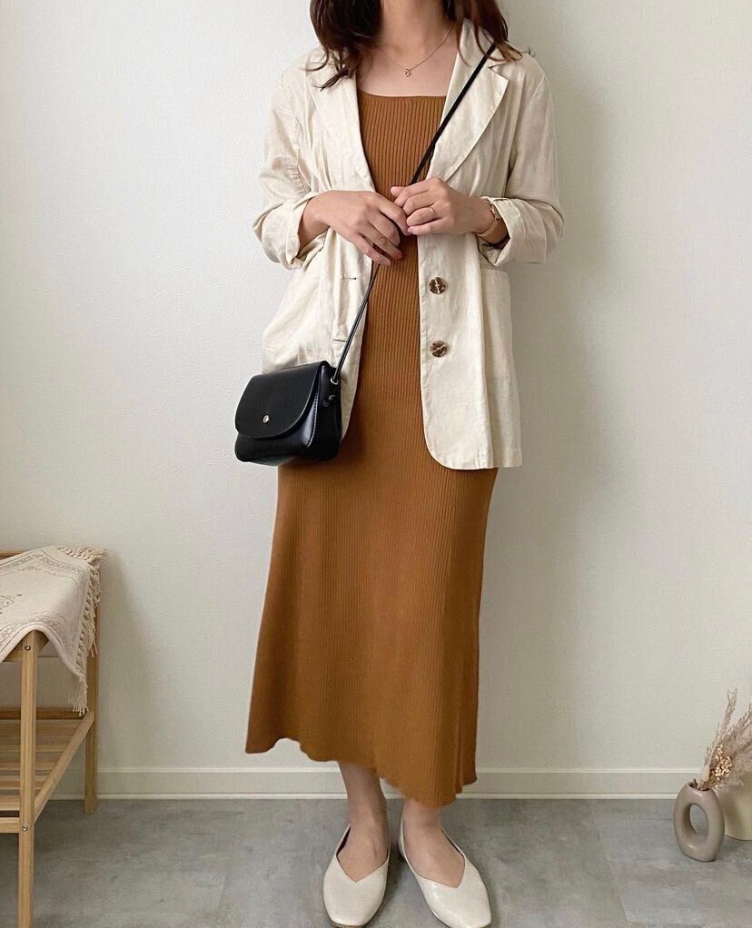 2023年春夏ファッションでも数多くのブランドが販売している定番アイテム・テーラードジャケットとも相性抜群です。1枚だとヘルシーな印象のリブニットワンピースもジャケットを合わせる事できっちり感がプラスされてまったく違う印象になりますね。学校行事やママ会などにも使える着回し力抜群のワンピースです。