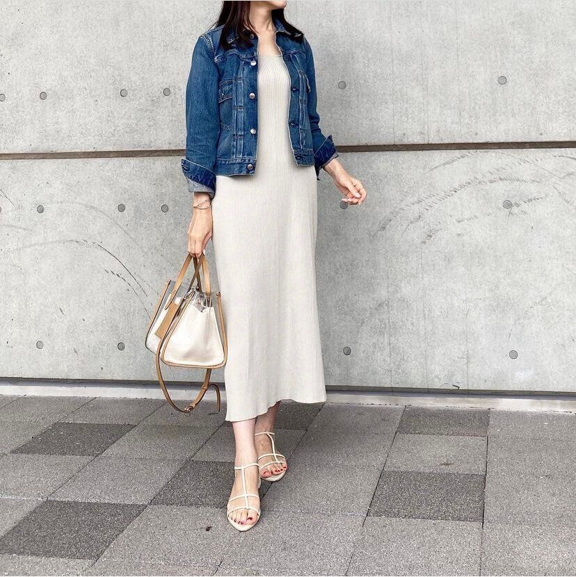 多くのファッションインスタグラマーがリブニットワンピースに合わせているアイテムの一つがデニムジャケット。少し短めのデニムジャケットを合わせればより目線が上にいくのですらっとした印象を与えてくれます。リブニットワンピースはカジュアルな印象が強いデニムジャケットを女性らしいコーディネートに仕上げてくれます。
