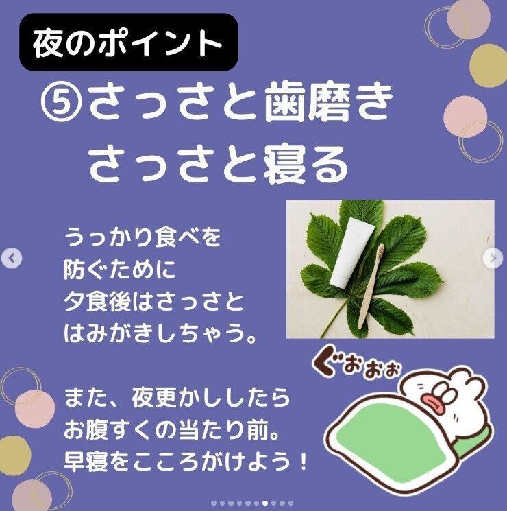 夜の過ごし方で大切なこと。夜更かしをするとやはりお腹はすいてくるので、うっかり食べてしまわないように、夕食後はすぐに歯磨きをして、早寝を心がけています。
