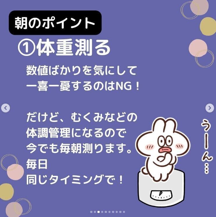 まずは朝、毎日同じタイミングで体重を測ります。少しの数値の変化で一喜一憂する必要はなく、体がむくんでいないかなど、体調管理のためにもなるそう。