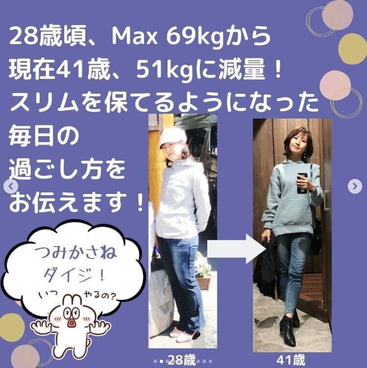 こちらが、28歳のときと、現在のビフォーアフター。顔の輪郭もスッキリ、お腹や、お尻まわりも大幅なサイズダウン。28歳のときよりも、40代の今が健康的で若々しく見えますよね。無理な運動やストイックな食事制限ではなく、栄養バランスを考えた食生活への改善、そして生活全般を変えたからこその結果なのです。