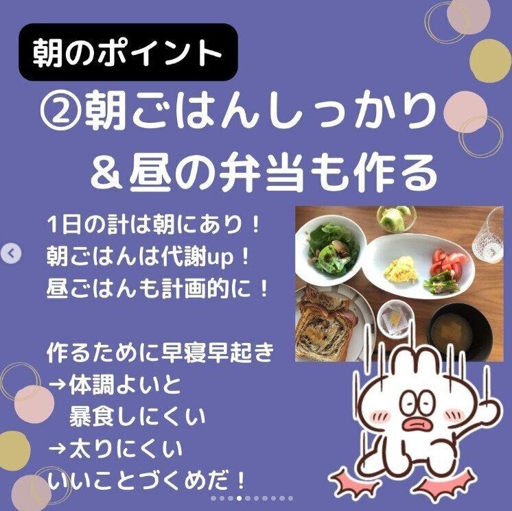 そして、朝ごはんをしっかりと食べることもポイント。代謝アップにつながります。また、朝ごはんと一緒に、昼のお弁当もつくっているのだそう。つくり置きなどを活用しながら無理なくお弁当生活を続けています。自然と早寝早起きの生活になり、体調もよくなり暴食もしにくくなるといいます。