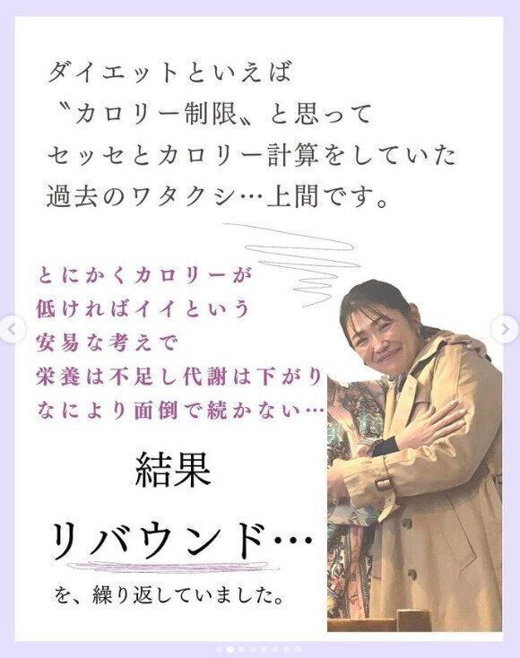 そしてこちらが現在のtabeyase_eriさん。栄養バランスを考えた食事と、腸を整えることの大切さを学び、自ら実践。若いころと比べると-20kgもの減量に成功し、輝くような笑顔とスリムで健康な体を手に入れたのです。