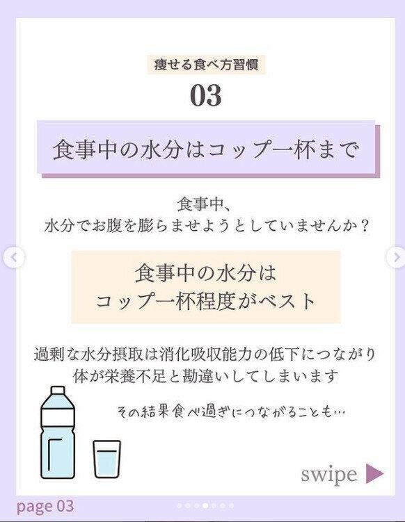 食事中の水分はコップ1杯がベストだといいます。過剰な水分摂取は消化吸収能力の低下につながり、体が栄養不足と勘違いしてしまうのだとか。その結果、食べすぎにつながってしまうといいます。