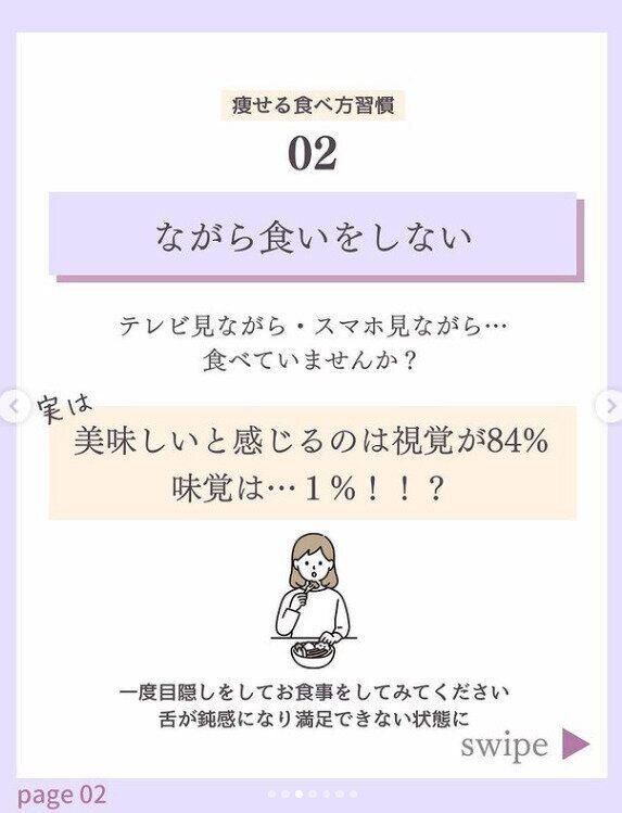 テレビを見ながら、スマホを見ながらなど、「ながら食い」をしていませんか?じつは、「おいしい」と感じるのは視覚が84%、味覚はなんと1%なのだそう。目隠しをして食事をすると、舌が鈍感になり満足できない状態になるといわれています。食べることに集中していない「ながら食い」では、満足できずに食べる量が増えてしまうのです。