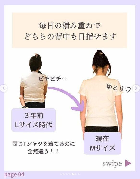 すべては毎日の積み重ね。おいしく食べて痩せたいなら、まずは正しい食べ方を習慣にすることが何よりも大切なことを教えてもらいました。習慣化していくことで体は変わるというのが、こちらの写真。同じTシャツを着ているのだそうですが、後ろ姿がまったく違いますよね!
