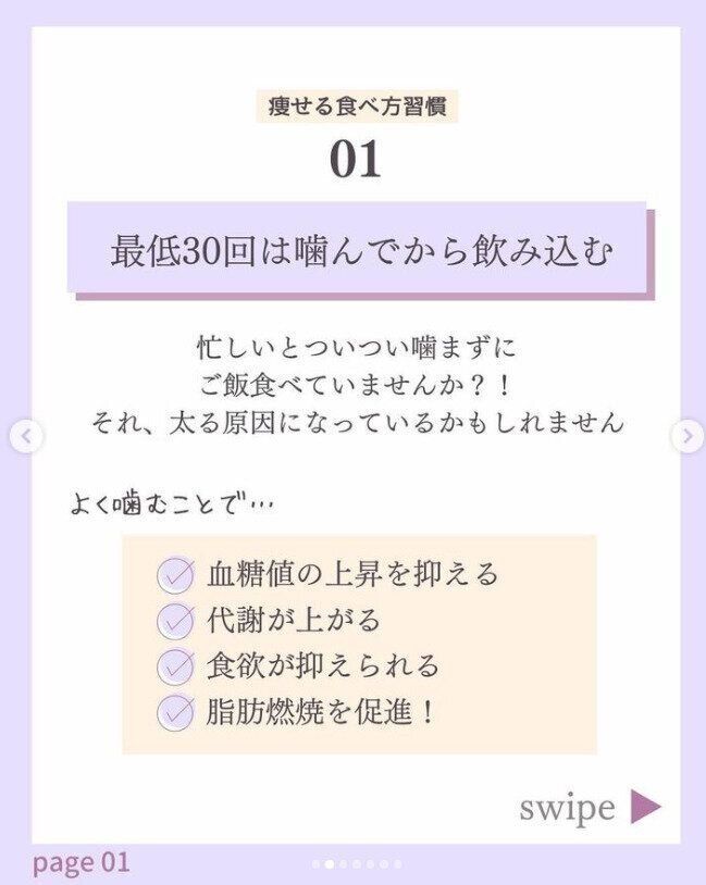 「いそがしいからとつい噛まずにごはんを食べていませんか?」とtabeyase_eriさんはいいます。これが太る原因になっていることもあるのだそう。最低でも30回は噛んでから飲み込む。じつはよく噛むことで、「血糖値の上昇を抑える」「代謝が上がる」「食欲が抑えられる」「脂肪燃焼を促進」など、うれしいことがいっぱい!