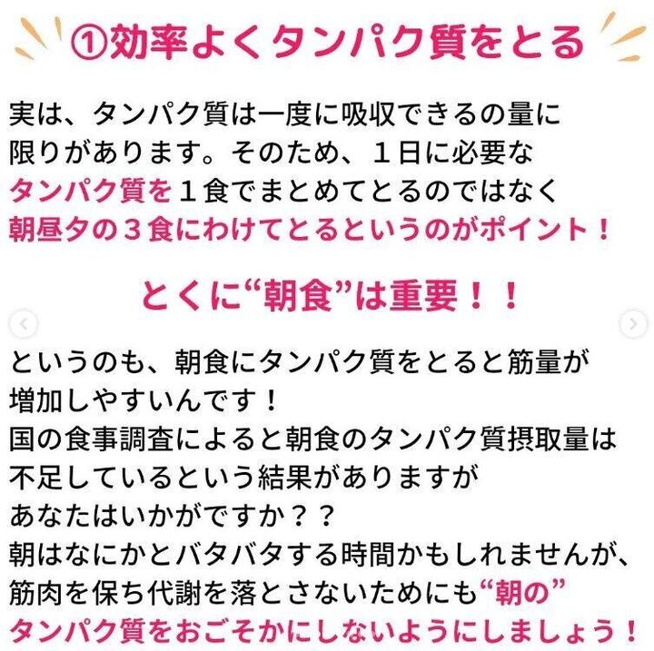体をつくるタンパク質。じつは1度に吸収できる量には限りがあるのだそう。タンパク質は1食で一気にとろうとするのではなく、3食に分けて。とくに、朝食にタンパク質を摂ると筋力が増加しやすいのだそう。朝はいそがしくてなかなか食べられないという人も多いですが、朝ごはんをおろそかにせず、栄養バランスを考えた食事を心がけてみましょう。