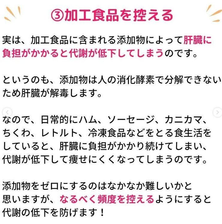 ハムやソーセージが大好物!という人も多いですよね。でも、こういった加工食品には添加物が含まれる商品も多く、肝臓に負担がかかり、代謝が低下してしまうのだそう。添加物をゼロにすることはなかなかむずかしいかもしれませんが、tabeyase.diet_kkさんもいわく、なるべく頻度を控えるようにすると、代謝の低下を防げるといいます。