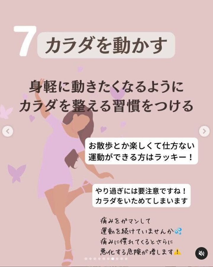 体を動かす習慣も続けているmiyabi.diet164さん。「身軽に動きたくなるように、体を整える習慣を身につけましょう」といいます。ただし、無理な運動は要注意。痛みを我慢して運動を続けていると、痛みに慣れてさらに悪化する危険が増します。なんでもやりすぎは要注意なのだそう。