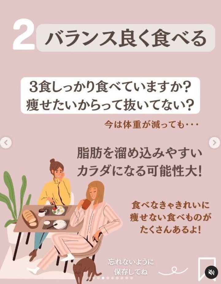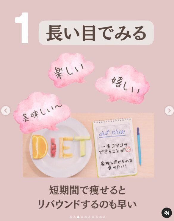 「40代以降は、急激に痩せると残念なくらい貧相にみえる」とmiyabi.diet164さんはいいます。短期間で痩せるとリバウンドをするのも早いのだそう。ダイエットは長い目で、一生コツコツと続けていけるものにすること。