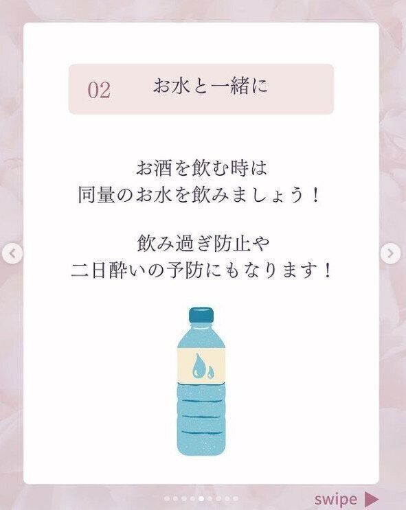 お酒を飲むときは同量のお水を飲むのがいいのだそう。飲みすぎ防止や、二日酔いの予防にもなるといいます。
