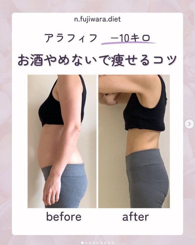 こちらがビフォーアフターの写真。体の薄さがまったく違いますよね。バランスの取れたボディラインも美しい!40代というと、「痩せづらくなった」と言う人も多いなか、ここまでの体の変化はすごいこと。じつは、n.fujiwara.dietさんも、食事制限のダイエットや、自宅トレーニングをがんばっても痩せなかったといいます。でも、ダイエットの知識を勉強し、食事のバランスをととのえたことで、-10kgのダイエットに無理なく成功。これほどの美スタイルを手に入れることができたのです。