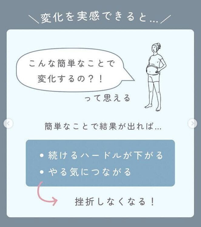 しかし、今回のダイエットでは、たとえストレッチだけの日があっても、体を動かす習慣が続いています。そのコツは、体の写真を撮ることでした。体重ではわからない体の変化も、写真を比べることで変化に気づき、「こんな簡単なことでも変化がでるんだ!」とモチベーションのアップにつながったといいます。そして、さらに結果が出てくるようになり、また運動が続く。写真を撮ることが好循環をもたらすことにつながったのです。