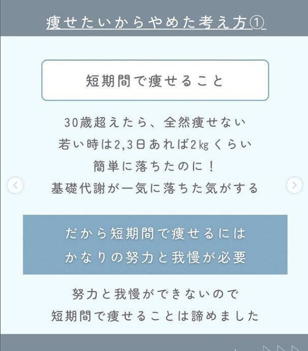 30代後半になり、yuumaro_diet_diaryさんは、ダイエットへの考え方が若いときのままである自分に気がつきました。「基礎代謝も肌レベルも違うはずなのに、同じ方法で痩せるわけがない」と、古い考えをやめたといいます。具体的に教えてもらいましょう。