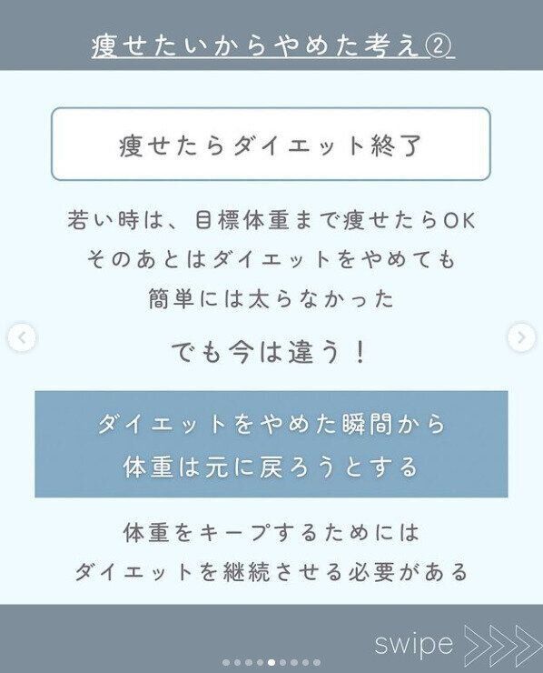 若いときは、目標体重まで落とせたらダイエットはそこで終わり。やめても簡単には太らなかったといいます。でも「今は、ダイエットをやめた瞬間から体重は元に戻ろうとする」ように感じるといいます。今の自分には、体重をキープするために、ダイエットは長く継続していくものだと考えるようになりました。
