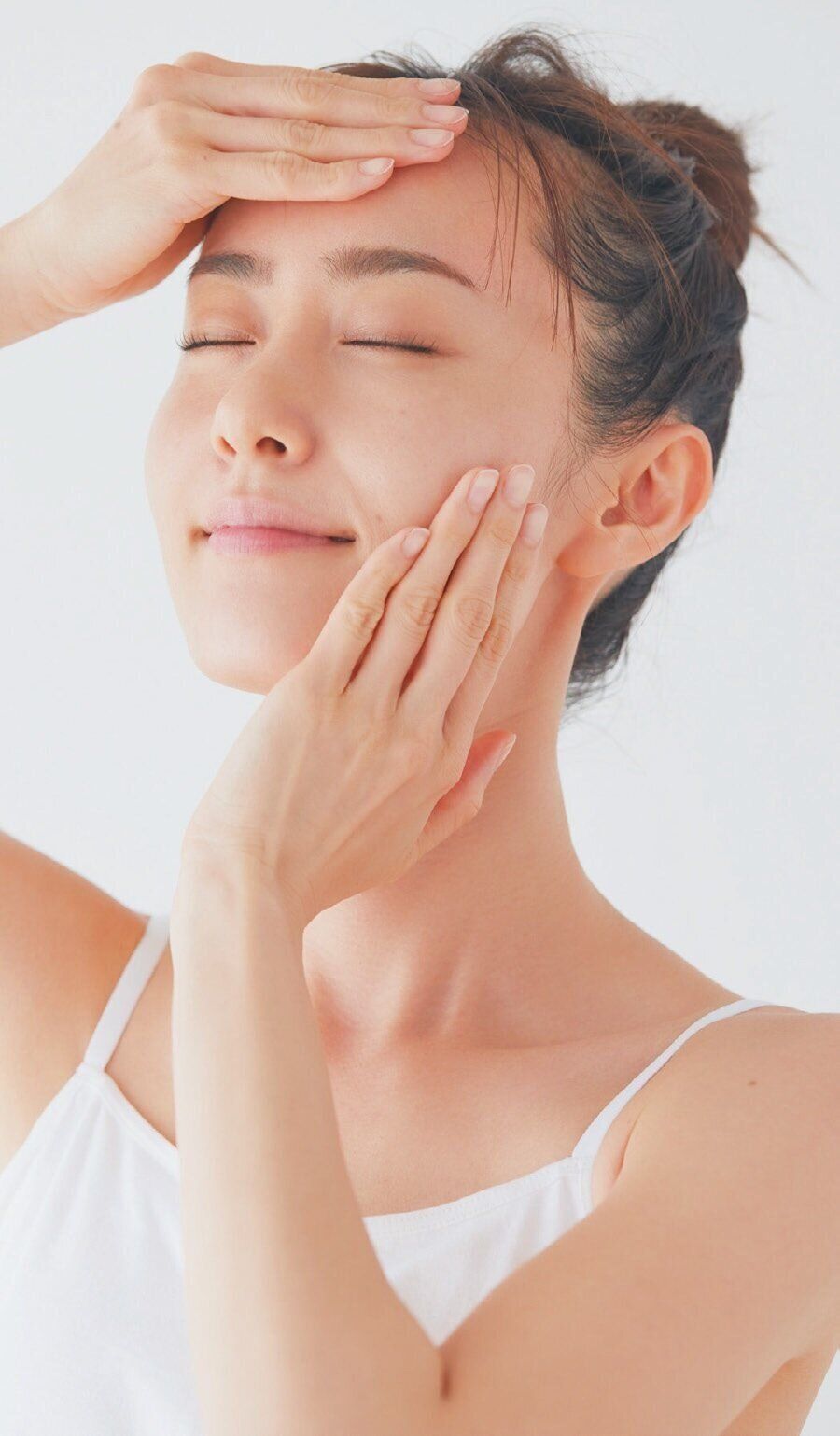 【夜】顔全体に厚めに塗り広げてマッサージ。鏡を近くで見て、内側→外側、下→上に向かって、たるみやシワの部分を引き上げるように塗ると効果的。